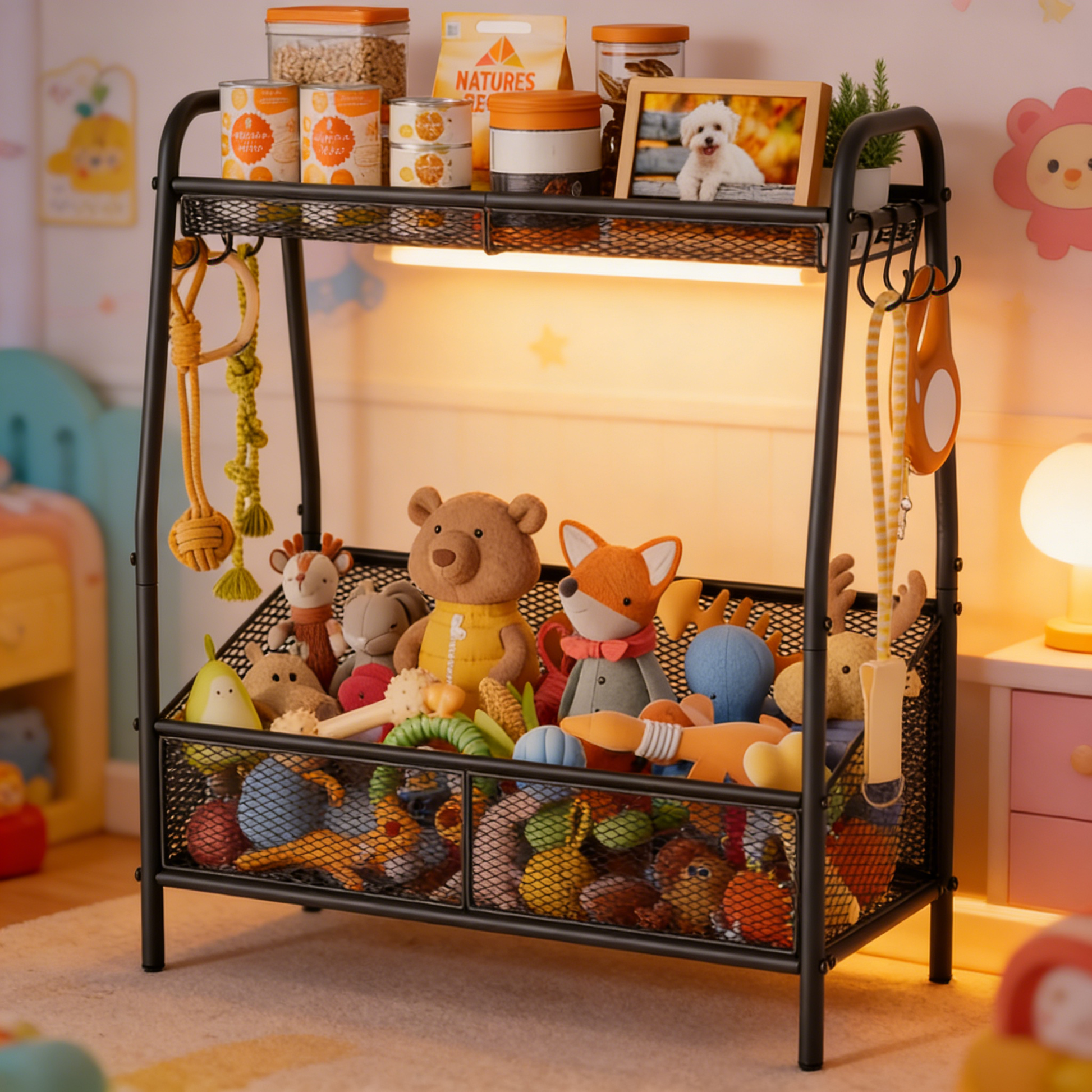 3-in-1 Dog Toy Storage Organizer with Hooks – Metal Pet Supply Shelf for Toys, Treats, Leashes & Collars
